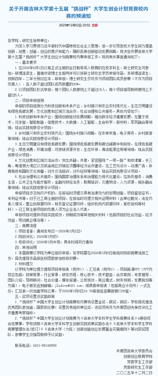 关于开展吉林大学第十五届“挑战杯”大学生创业计划竞赛校内赛的预通知
