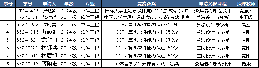 学院于2026年4月开展了程序设计类竞赛获奖学生申请课程免修工作,根据学生申请,经学院竞赛指导教师免修工作小组专题讨论,教学委员会通过,课程免修结果如下: