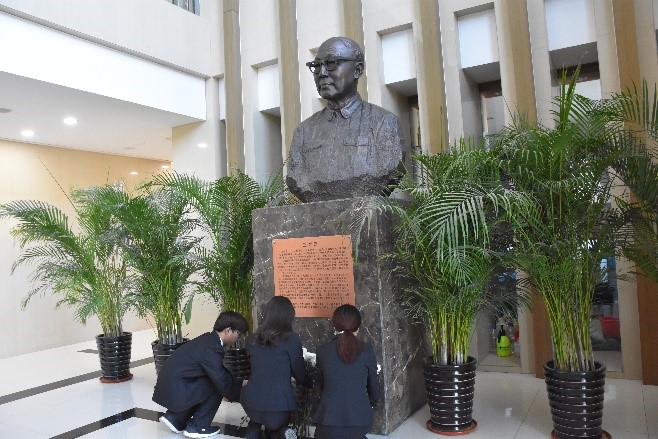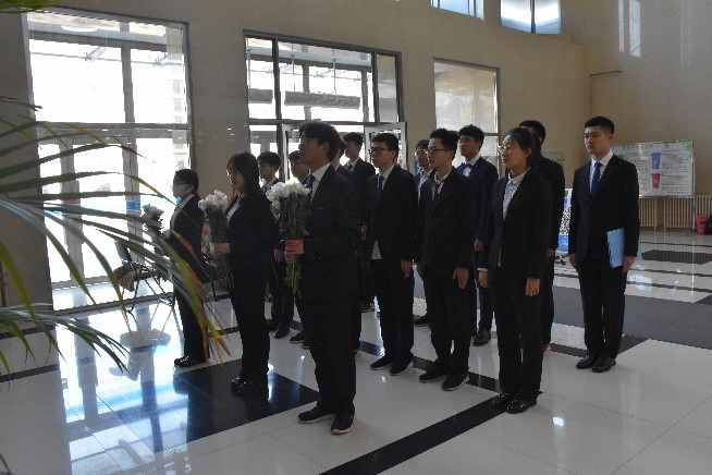 同学们面对雕像集体默哀,缅怀王湘浩院士的音容笑貌,向他表达无限的敬意与哀思。气氛庄重严肃,虽无言,却似有千言万语。随后,学生代表进行发言,向大家传达祭奠前辈、追忆先贤的感悟,号召同学们继承和发扬王湘浩院士所倡导和践行的优良传统,为学科振兴与辉煌而努力奋斗。最后,三名学生代表来到王湘浩院士的雕像前,郑重地献上手中的鲜花,并鞠躬致敬,寄鲜花来表达对王湘浩院士的无限怀念。