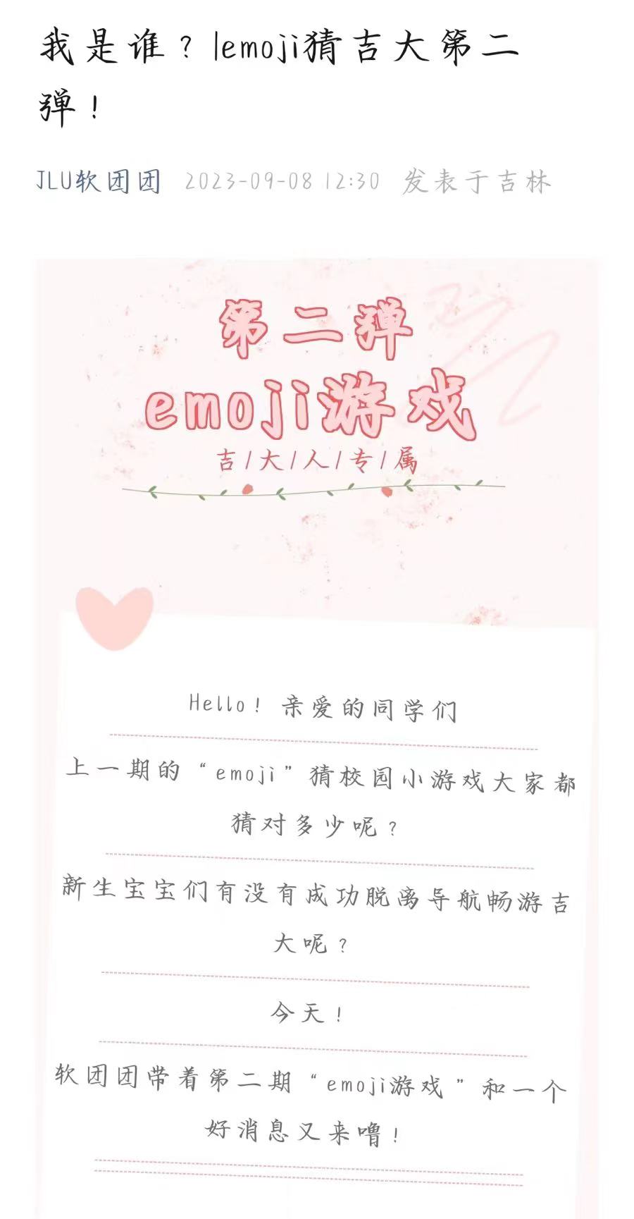 近日举办了一场别出心裁的活动——“Emoji猜校园”活动。这一创新性的活动以趣味猜校园的方式,旨在帮助新生更快地熟悉吉大校园环境,培养他们对学校的认同感。