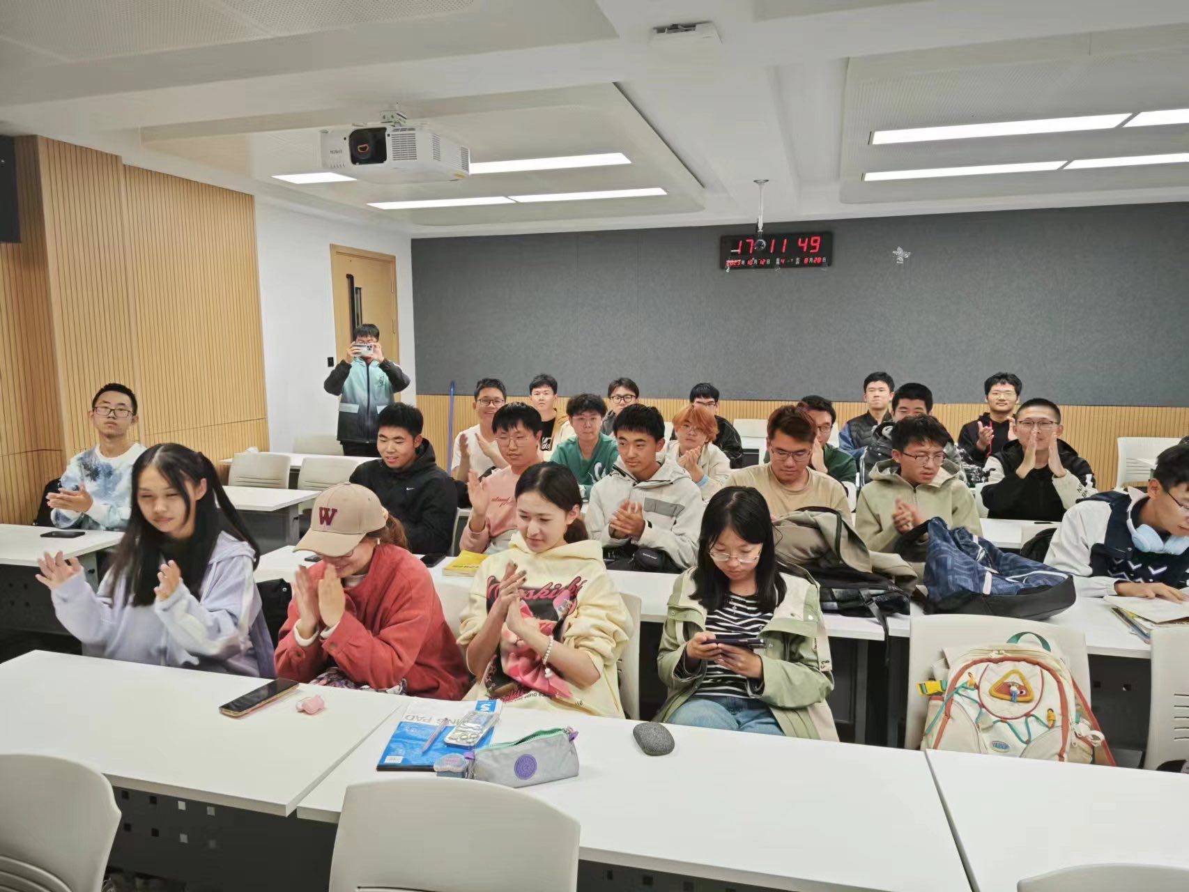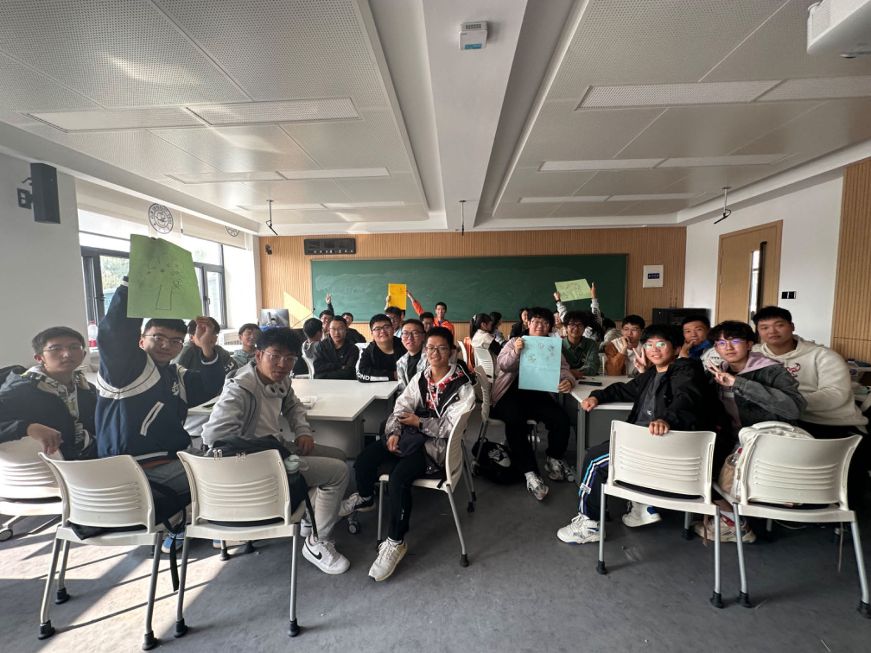 活动的第一个环节是“一分钟鼓掌”的热身游戏,同学们需要在游戏开始前对自己的鼓掌次数进行预测,并在实际游戏过程中记录鼓掌次数,通过对比预测和现实中的次数结果来分享游戏体会。大家从这个游戏中感悟到了设定合理预期目标和遵循职业生涯发展规划路线的重要性,懂得了只有结合具体条件明确自己在大学期间的目标并坚持执行,才会最终实现人生理想。随后,同学们随机分组,在依次进行简短的自我介绍后,正式开始了一系列趣味团体游戏。 在“信任之旅”的游戏中,同学们被分为两组,一组同学的双眼被蒙住来体验盲人的感觉,另一组同学作为领路人,在没有语言沟通的情况下带领第一组同学走到终点,培养了同学之间的信任感与合作精神。在“集体登陆”的游戏中,各小组的同学需要全部站到一张A4纸大小的范围内,大家集思广益,不断尝试,通过默契的配合顺利地完成了游戏的任务。在“人体字母”的游戏中,同学们利用自己的身体摆出不同的字母造型,合力完成了单词的拼写,展现出了强大的团队凝聚力。最后,大家拿起手中的画笔,以小组为单位,共同绘制出了团体树并写下了对于大学生活的美好期许,活动在一片欢声笑语中圆满结束。
