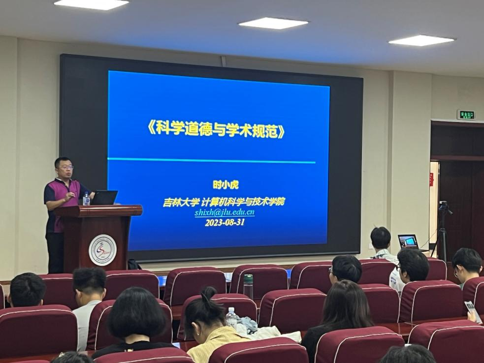 于王湘浩楼B108开展科学道德与学风教育专题讲座。本次专题讲座由时小虎教授主讲,研究生辅导员张译心主持,全体2023级研究生参加本次活动。