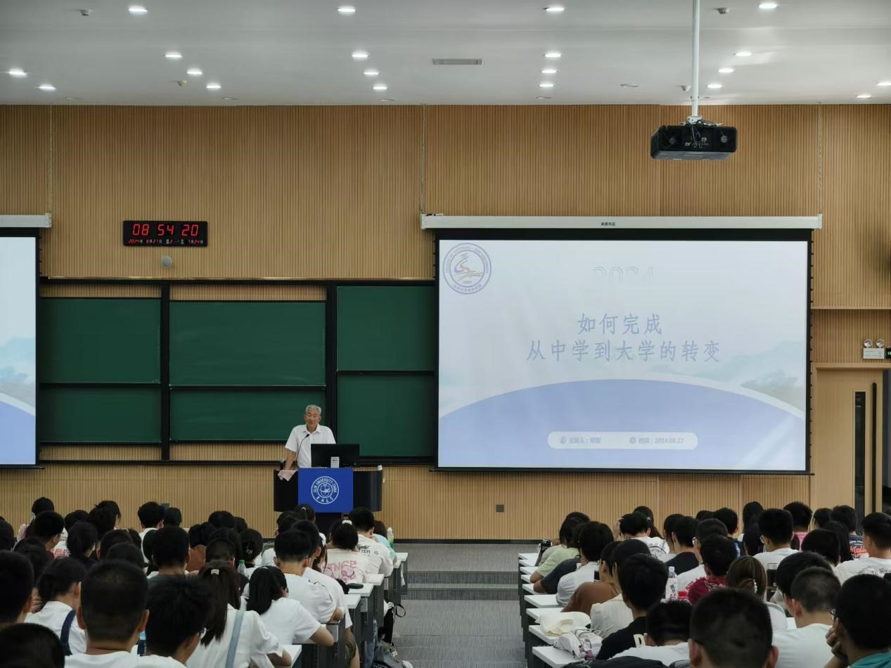 于8月27日在敬信教学楼第五阶梯教室举办了新生入学教育系列活动——助力大中衔接专题讲座。本次讲座邀请了吉林大学关工委副主任柳军担任主讲嘉宾,为2024级全体新生带来了一堂生动且富有启发性的教育课。