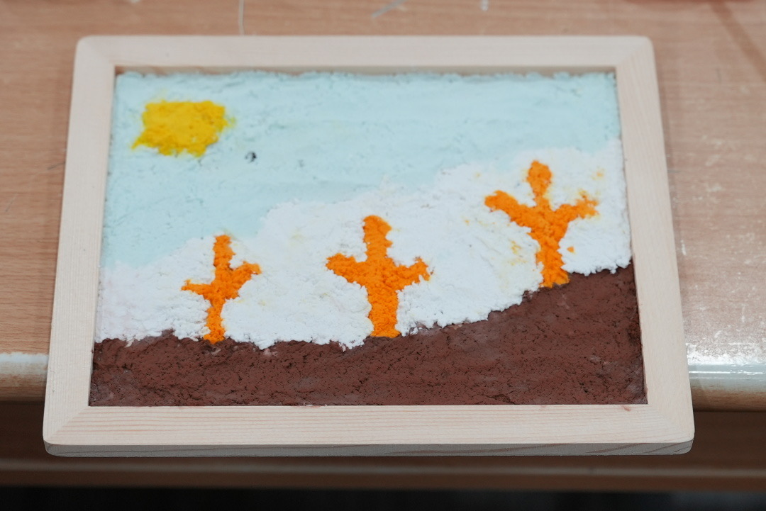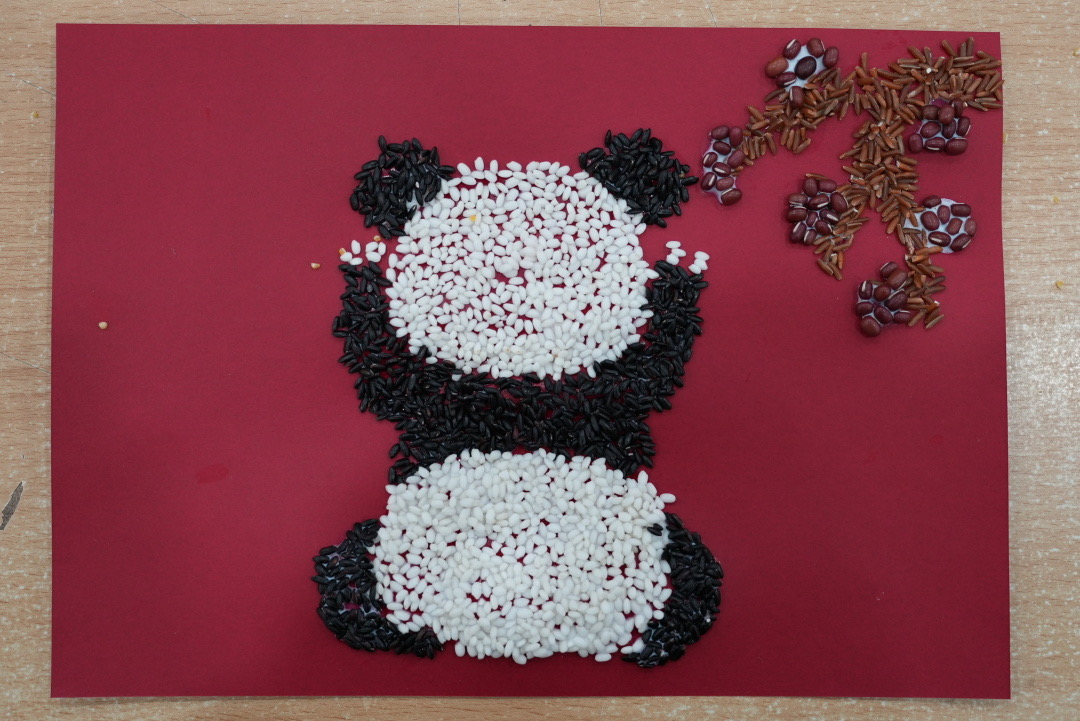 在介绍制作方法后,同学们自行选择工具及材料,自由创作正式开始。经过3个小时的创作,粮食画创作组的同学们,巧妙运用红豆、绿豆、彩米等材料,思考颜色、大小等设计,组合拼贴成星空、花卉、蝴蝶、海绵宝宝、熊猫等图案。纸浆画小组的同学们则调配各种自己喜欢的颜色,利用纸浆立体性的特点,塑造栩栩如生的图案。大家一丝不苟的制作,每一处都仔细雕琢,在同学们的巧手下,各种图案跃然纸上,有金色麦天卷起朵朵浪花,夜游深邃的天空星光灿烂。